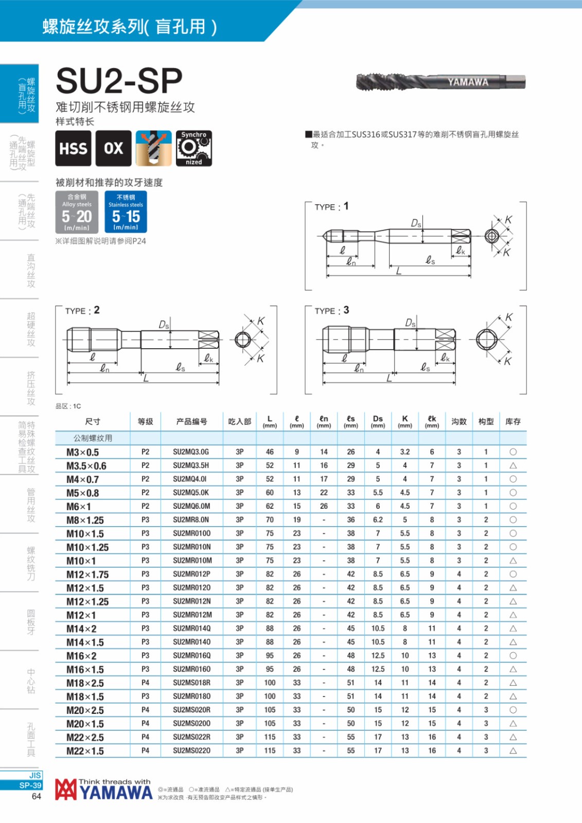 * 最適合加工SUS316或SUS317等的難削不銹鋼盲孔用螺旋絲攻。